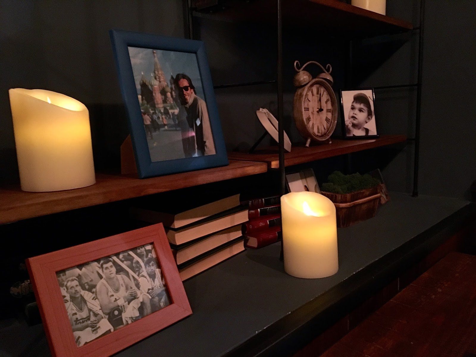 El comedor principal es normal, tiene muchas mesas y una decoración minimalistas con líneas sencillas. La zona más apartada en la que nos sentaron me cautivó. Había una biblioteca enorme con fotos de su época de jugador de baloncesto y de sus viajes por el mundo.