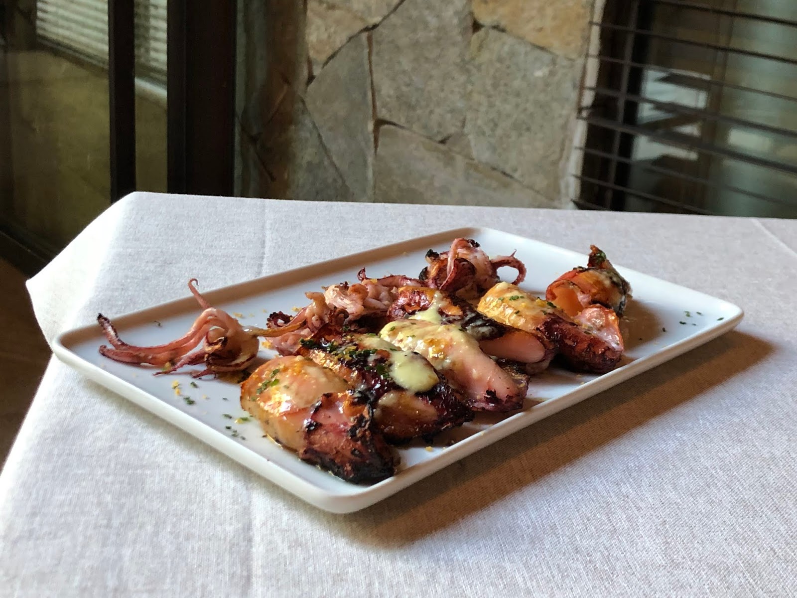 Lamentablemente no pude hacer foto del aguacate relleno a la brasa, porque al principio nos sentaron un poco en penumbra, aunque luego conseguimos cambiarlo, pero se pasaba de bueno. Como que hasta parece que cunde poco y que es poco contundente, pero para nada. Dice la definición de aguacate que es un fruto contundentísimo. La merluza se desmenuzaba con mirarla, no hacía falta ni decirle alojomora y los chipirones, en su justo y perfecto punto de cocción. Los pedimos encebollados, por cierto. También había opción de pedirlos a la brasa. De la tarta ya no hablamos. Ni pidáis la carta de postres. No sé qué más hay. Si una tarta de queso se os queda corto como postre, pues pedís dos. Es increíble. Es broma, haced lo que queráis. Y si no os gusta el queso, os compadezco fuerte.