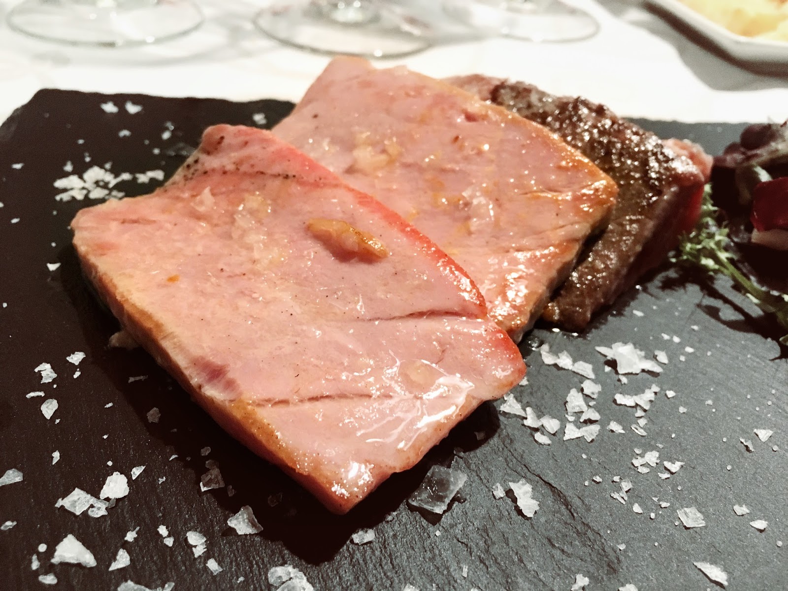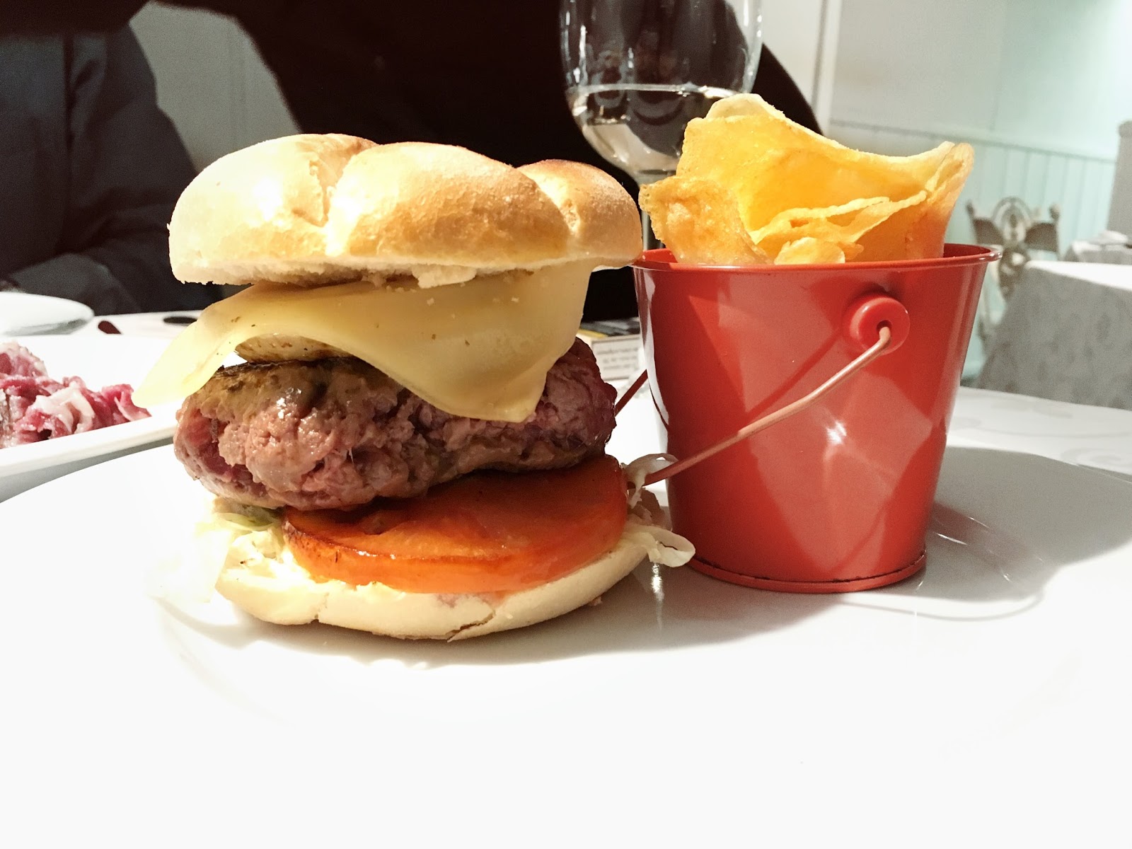 Nuestra elección fue revuelto de Boletus Edulis, que es de boletus de verdad (parece un poco pedante mencionarlo, pero pocos restaurantes pueden presumir de servir auténtico boletus), y tomate con ventresca para compartir, hamburguesa Attrezzo (225 grs. de auténtica carne de vacuno), atún a la pizarra, y chuletón de buey de 1kg con patatas fritas. Y de postre, delicia de chocolate.