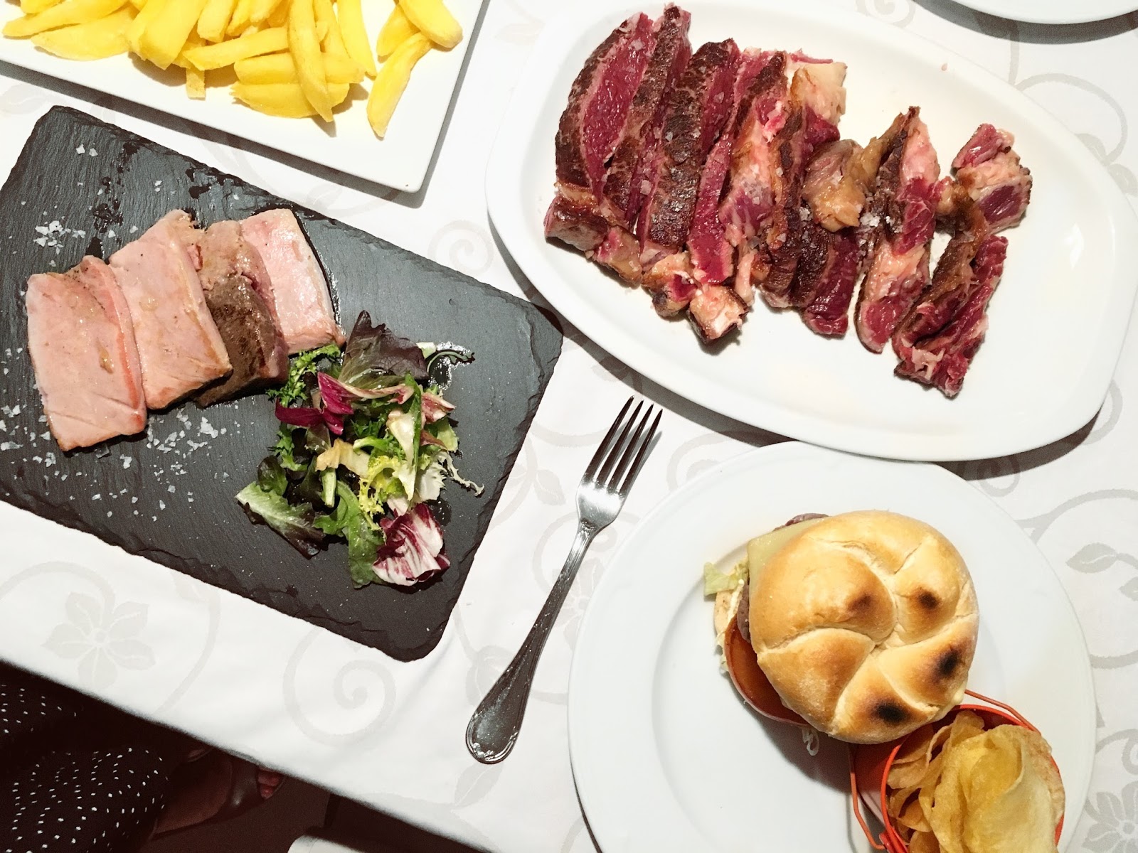 En cuanto a los segundos platos, si en algo destaca Attrezzo es en el punto de la carne, ya sea de la hamburguesa, del chuletón o del atún. Y lo mejor es que todo sale poco hecho y caliente, que parece imposible a día de hoy que te entiendan con el punto de la carne. Las patatas son cortadas a mano y fritas en casa, y se nota. Todo muy abundante para cuatro, pero somos de buen comer.