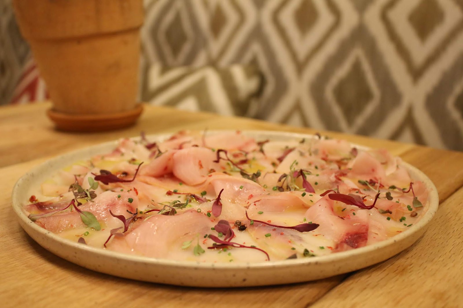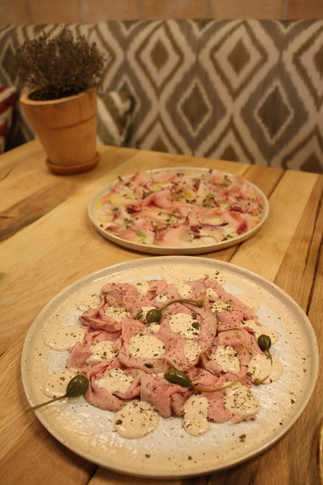 Evidentemente tiene pastas y pizzas, pero son espectaculares los entrantes antipasti, en nuestro caso vitello tonnato y carpaccio de pez espada ahumado. Si volviese, no me perdería ni las flores de calabacín ni las berenjenas a la parmesana.