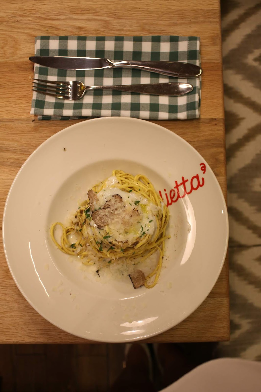 De segundo compartimos espagueti al tartufo con queso parmesano y huevo poché y fazzoletto relleno de calabaza, galleta de amaretto y parmesano. Los dos buenísimos, por los fazzolettos son originalísimos y dulzones, a la par que contundentes. Mis favoritos sin duda.