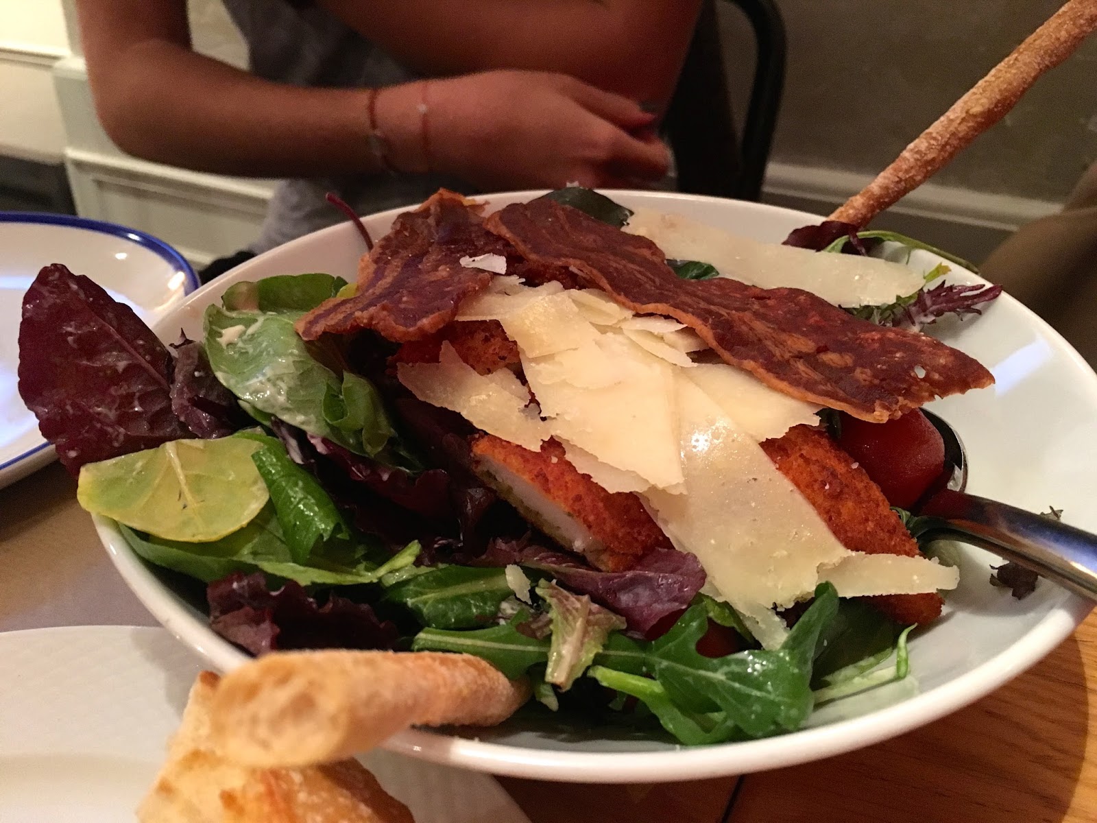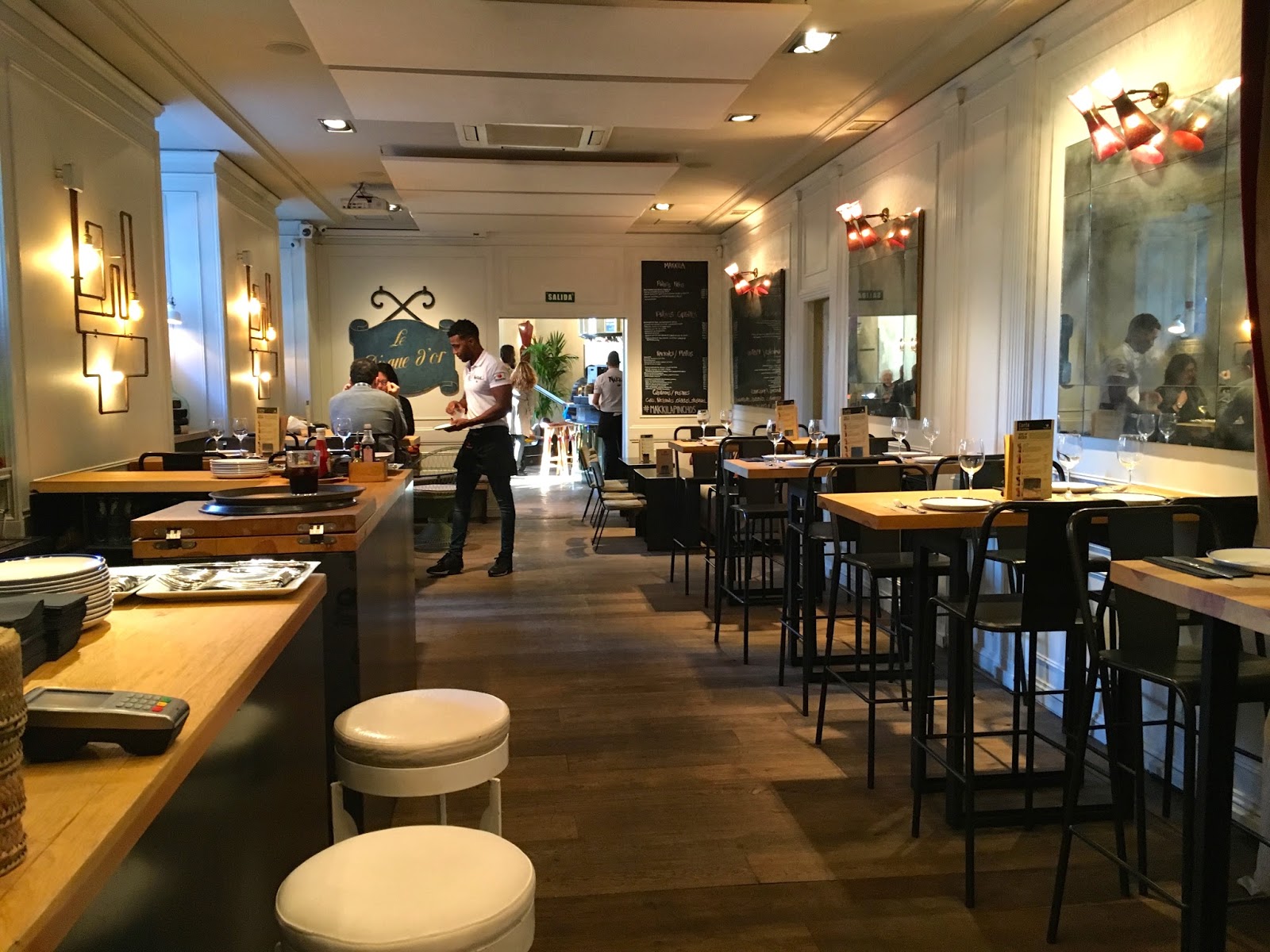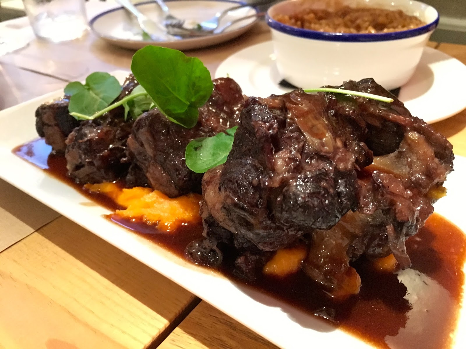 Fuimos cuatro y pedimos pintxo de pan tumaca con jamón ibérico, pintxo de tortilla de patata con cebolla caramelizada, pintxo de ensaladilla rusa, pintxo de secreto ibérico con cebolla confitada y salsa de Torta del Casar, ensalada de pollo crujiente al parmesano, arroz cremoso de calamares (para mí LO MEJOR, sin duda), rabo de toro con puré de boniato y de postre, la tarta del día, que era de zanahoria y tarta de queso.