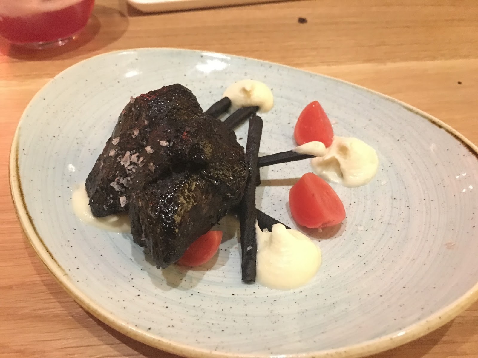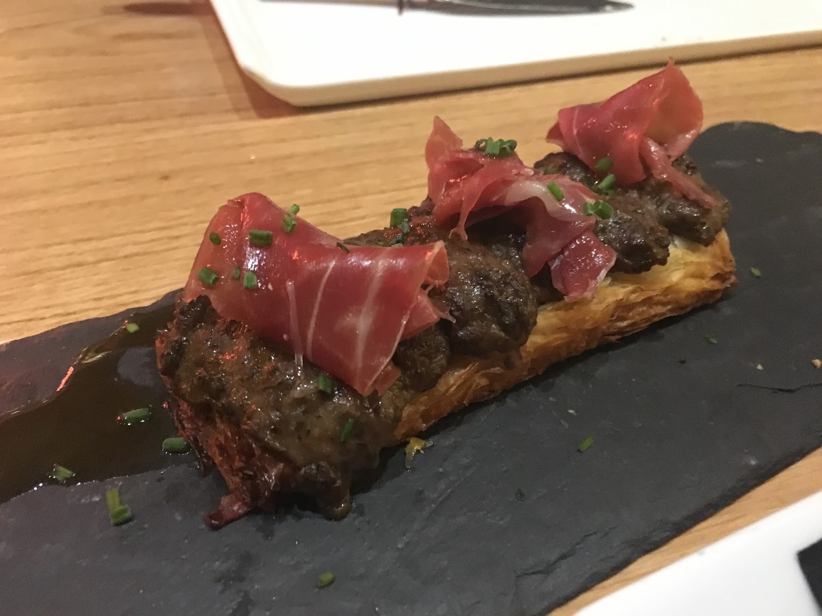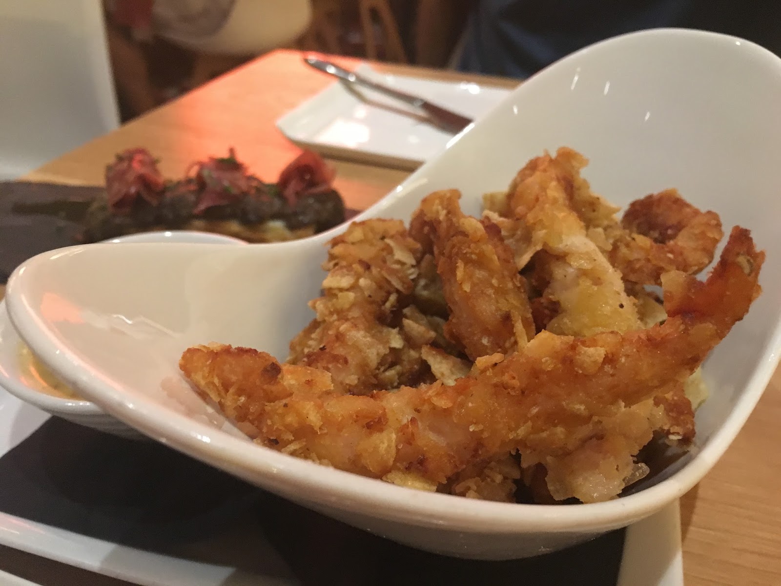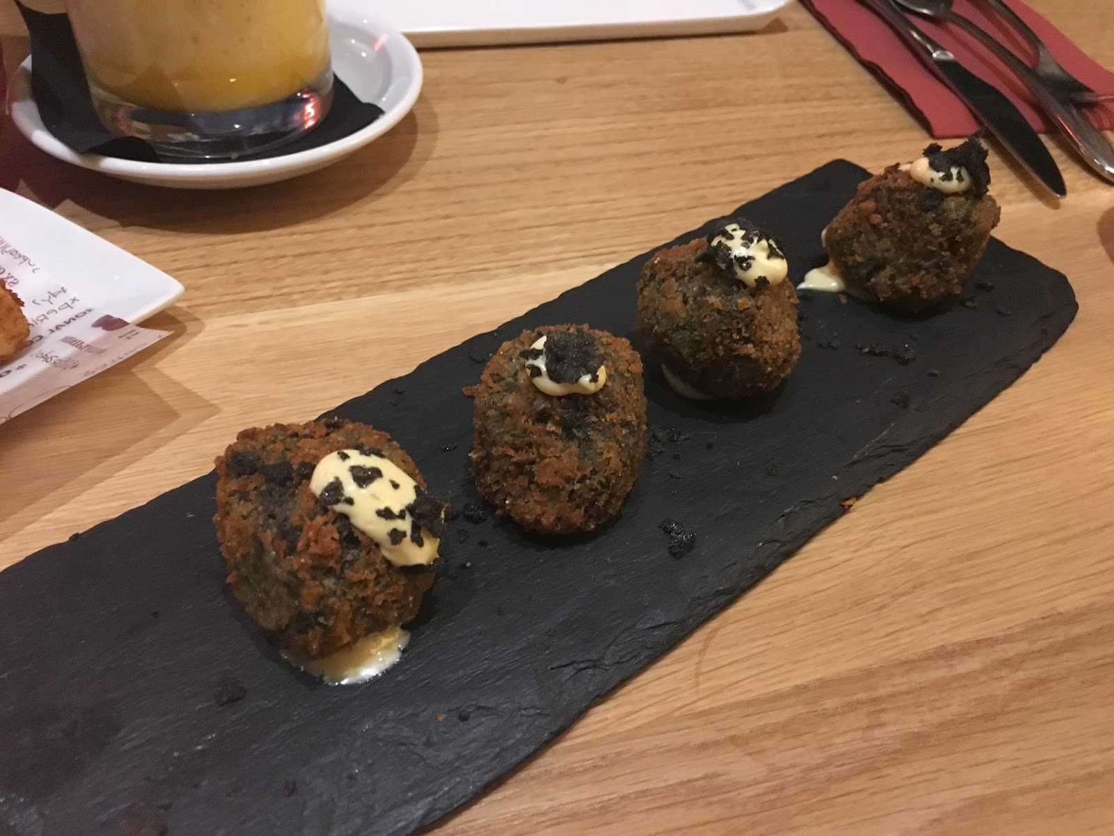 Esta vez pedimos cosas muy diferentes, bueno, quitando el huevo trufado con patatas y jamón, que yo no lo perdono. Además, elegimos croquetas de jamón, finger chips de pollo con salsa de mostaza y miel, tosta de hojaldre con ragoût de champiñones y jamón y de postre, leche con galletas, otra vez.