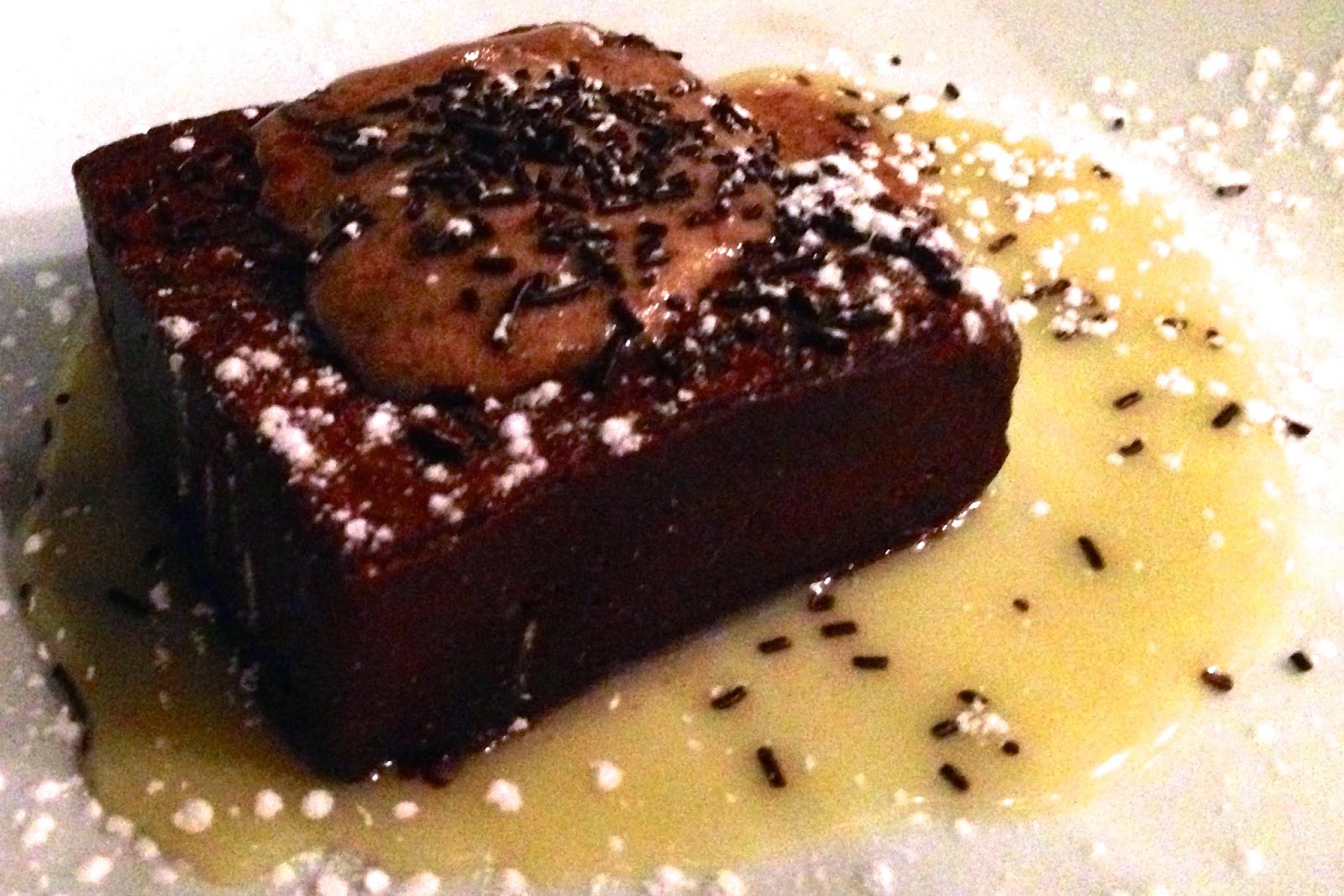 De postre, amor por el chocolate. Queríamos tarta de queso, pero no les quedaba, y pedimos dos brownies. Dos brownies que no son brownies, son mousse de chocolate a punto de bizcocho y sabe como la masa de una tarta de chocolate. Descansa sobre un charco de chocolate de blanco y se deshace en la boca. Amor por el chocolate… Y tanto…