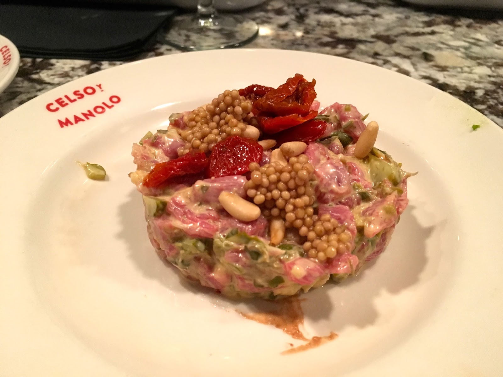 Fuimos en busca de un tartar, y me llevaron a la Tasca Celso y Manolo, al lado del hotel Room Mate Óscar y de Yakitoro. Celso y Manolo está a reventar de gente, por lo que tuvimos que cenar en barra, pero muy a gusto.