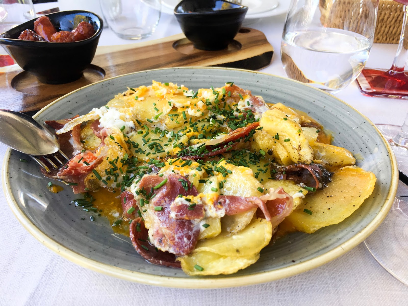 En la carta predominan los platos a la parrilla, y eso se nota en los barrotes de hierro negro que revisten el edificio, sin embargo nosotros elegimos para compartir croquetas al humor del cocinero, huevos rotos trufados con jamón ibérico, y unas setas fuera de carta.