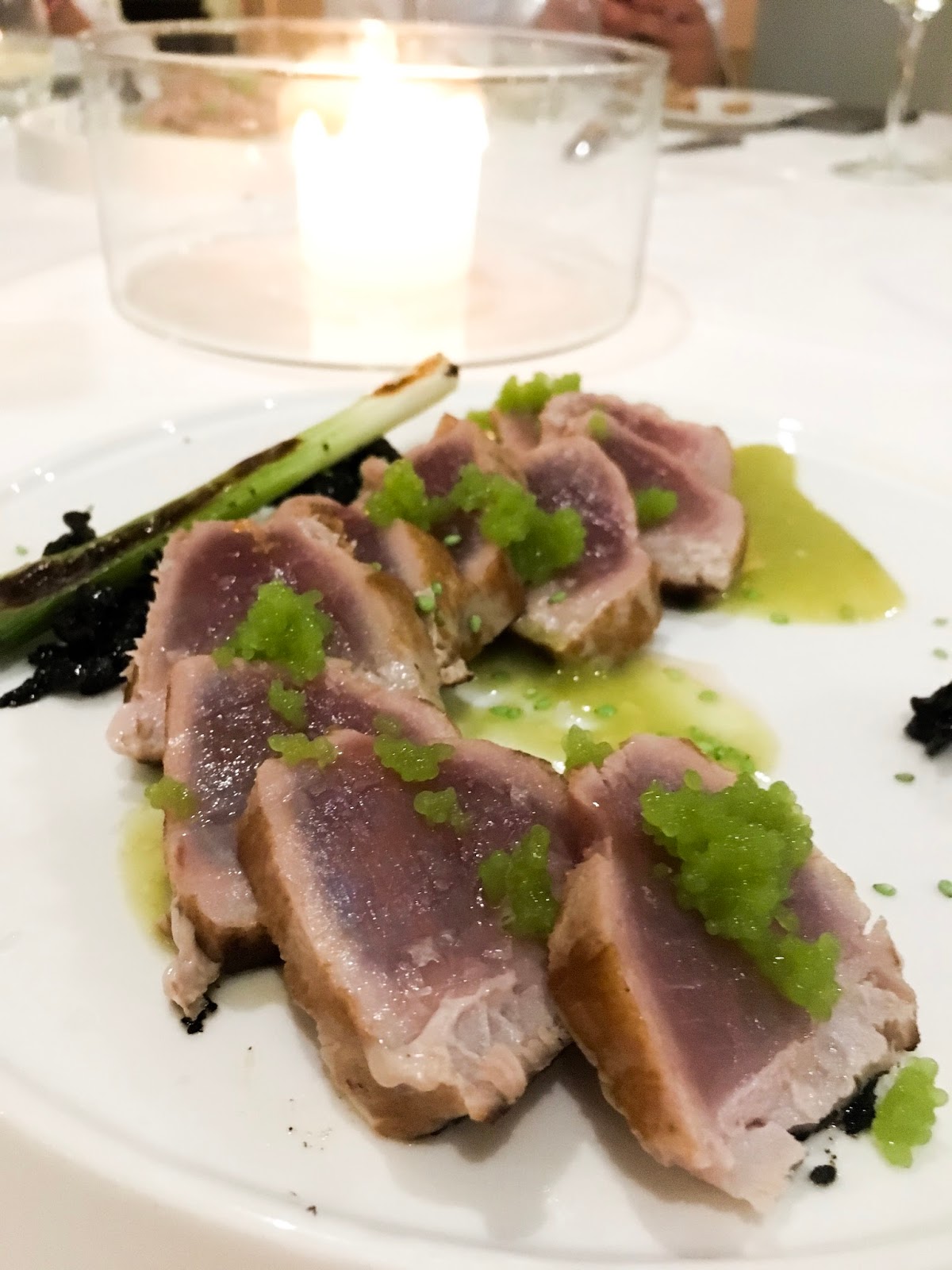 perlas de wasabi, steak tartar, muslo de pintada con escabeche de pera,