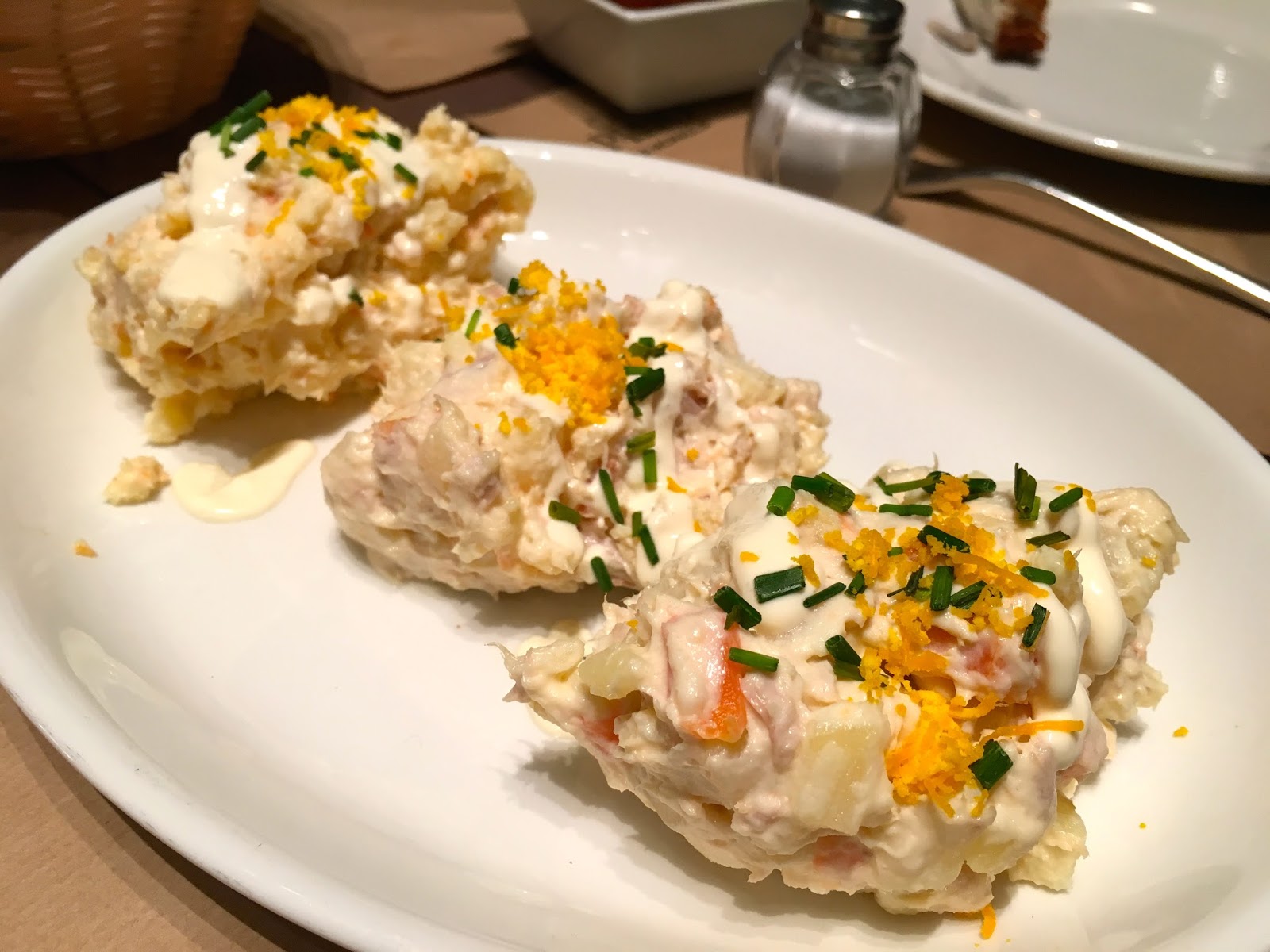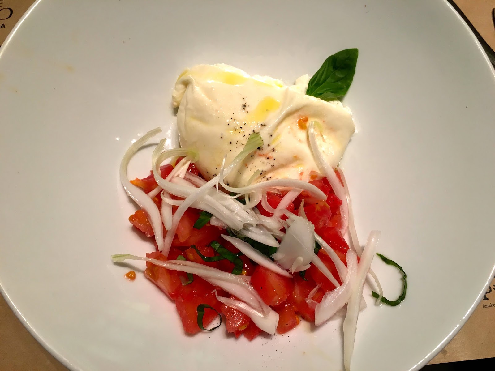 Fuimos cuatro y pedimos: empanadilla picante, alitas de pollo barbacoa, ensaladilla rusa, burrata con tartar de tomate, cebolleta y albahaca, pizza de pollo barbacoa, hamburguesa de angus con queso y huevos rotos.
