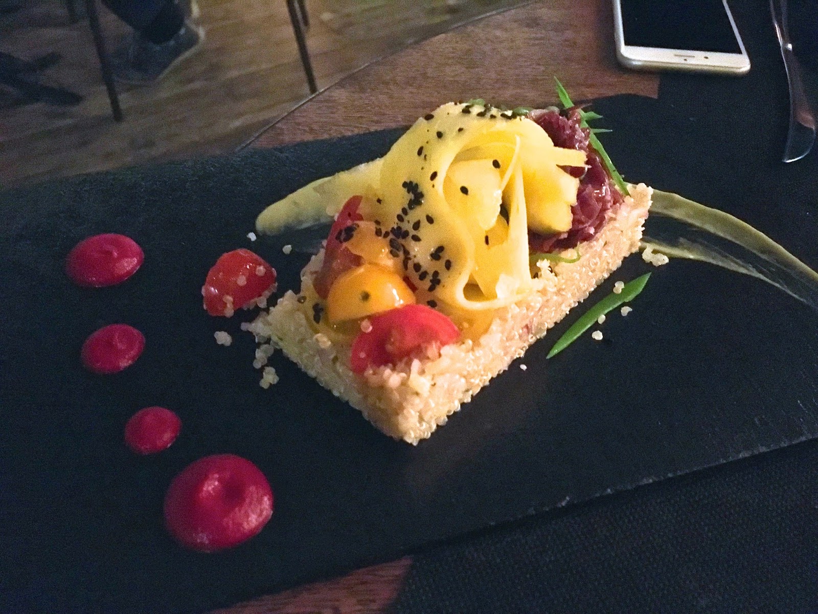 La carta es bastante variada. Encontramos desde salmorejo o burrata hasta risotto de setas con foie o albóndigas de rabo de toro pasando por gyozas o pez mantequilla con miso y cebolla encurtida. Nosotros fuimos a cenar un martes, por lo que, intentando cenar ligero, pedimos para compartir todo: ensalada de quinoa, mango y jamón ibérico, tartar de salmón con aguacate y ají amarillo y tempura de verduras.