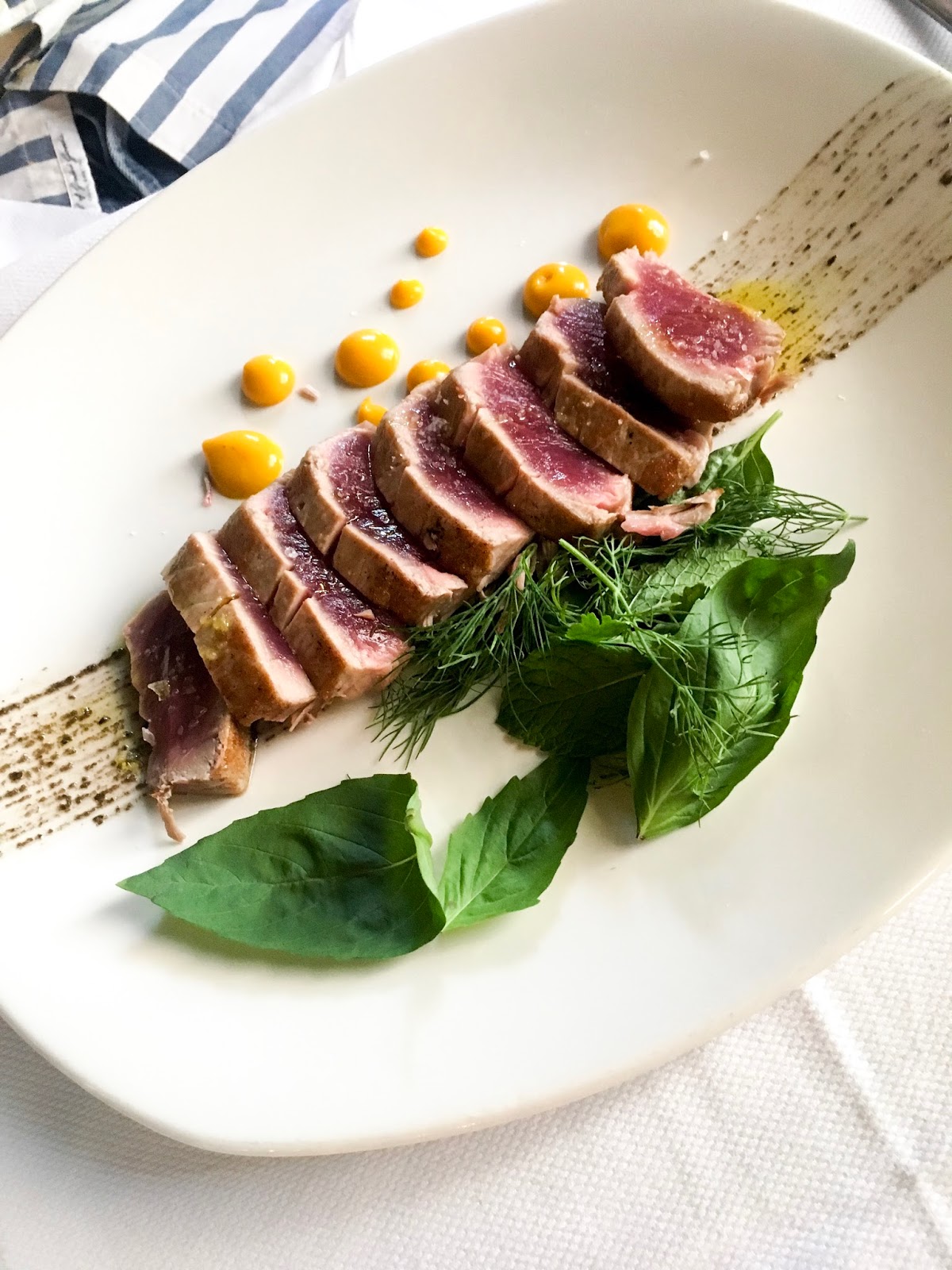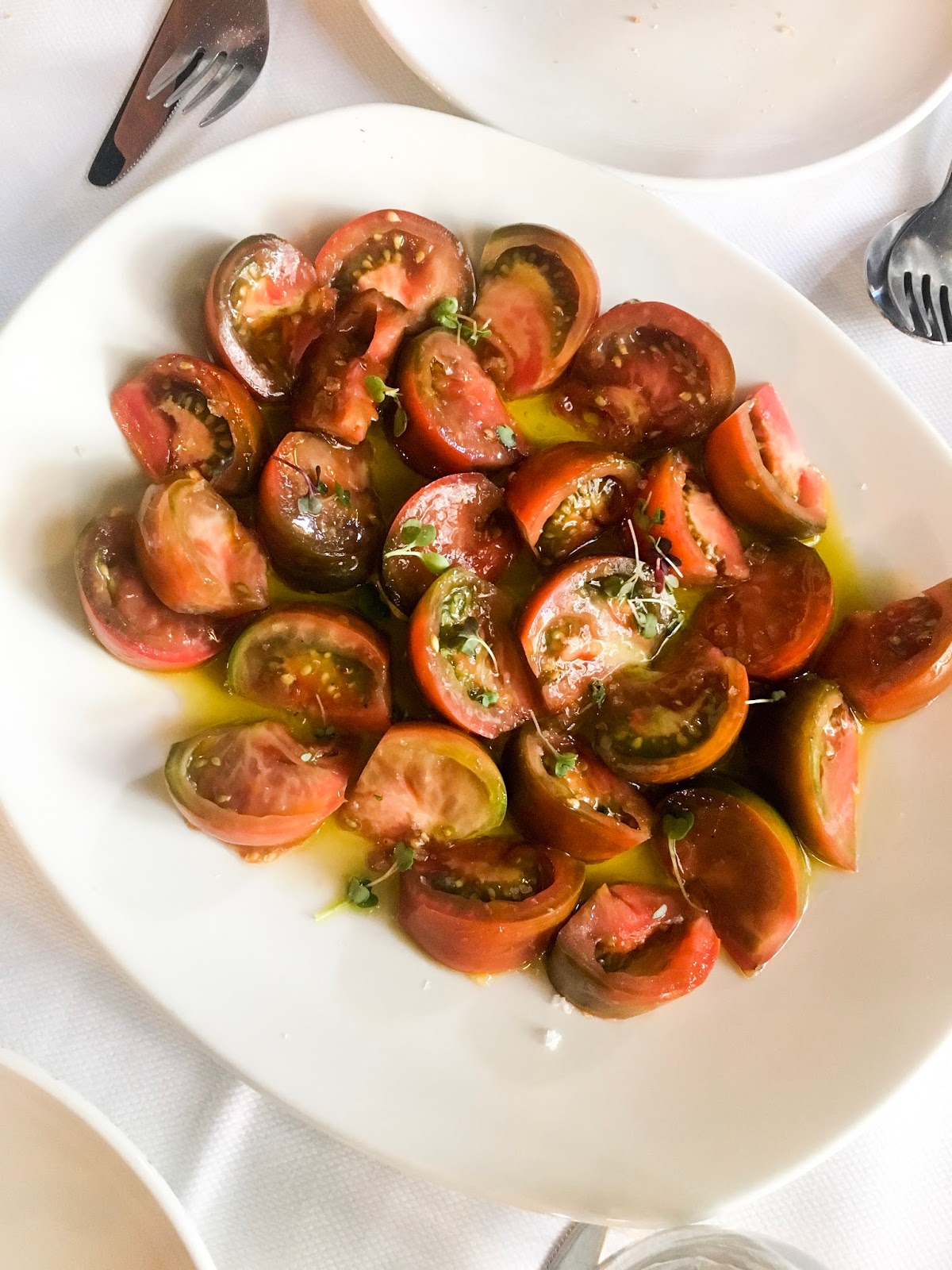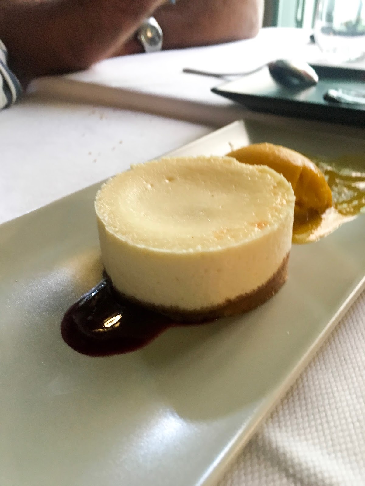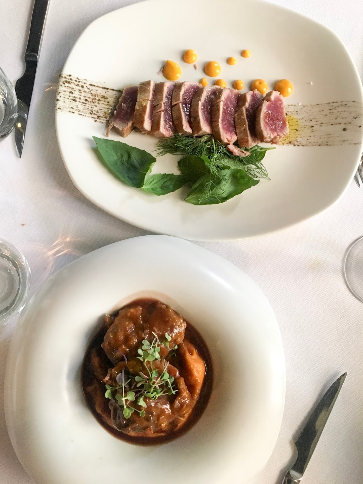 Pedimos cuatro entrantes para compartir y un plato principal cada uno. Muy recomendados, al final decidimos probar el tomate eco de Almería, salmorejo cordobés, ensaladilla de gambones La Encarna, mejillones en cocotte y manzanilla de Sanlúcar de Barrameda. Súper abundante para cuatro. Después, dos de taco de atún rojo de Barbate, unas albóndigas de choco y carrilleras ibéricas. De postre, tarta de queso con compota de frutos rojos y helado de mango y un bizcocho de chocolate líquido con caramelo de cacao y helado de jengibre.