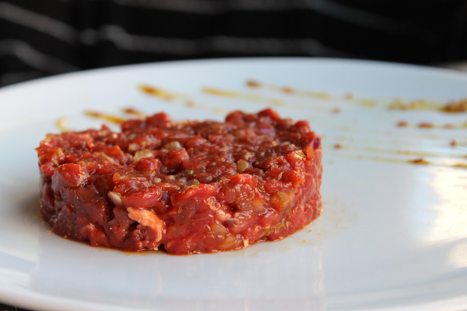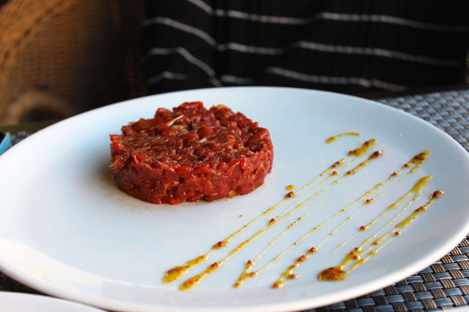 La terraza es cubierta y súper agradable. La carta muy variada, con muchas opciones para celiacos (mi acompañante de esta vez lo es), así que no tuvimos problemas a la hora de elegir. Nos decantamos por una ensaladilla rusa y una ensalada de tomate mozzarella y pesto como entrante y para compartir de segundos, steak tartar y tartar de salmón.
