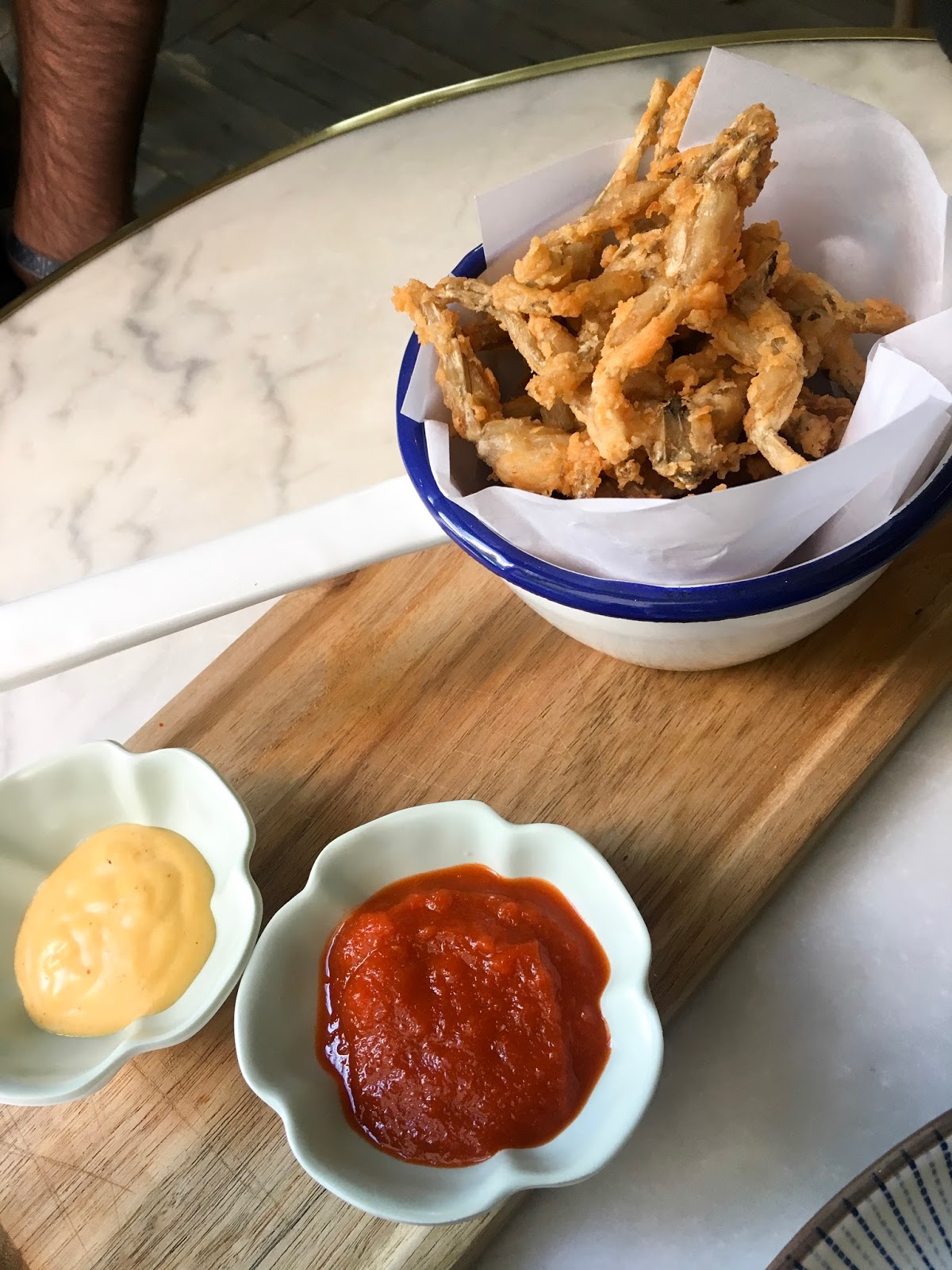 Frogi son ancas de rana con mayo de cilantro y mojo rojo. Es verdad. Saben a pollo. Son un horror para comer, porque tienen muchos muchos huesecitos, y además la ración es muy generosa, así que se tarda un rato. Es una receta curiosa y muy rica de sabor.